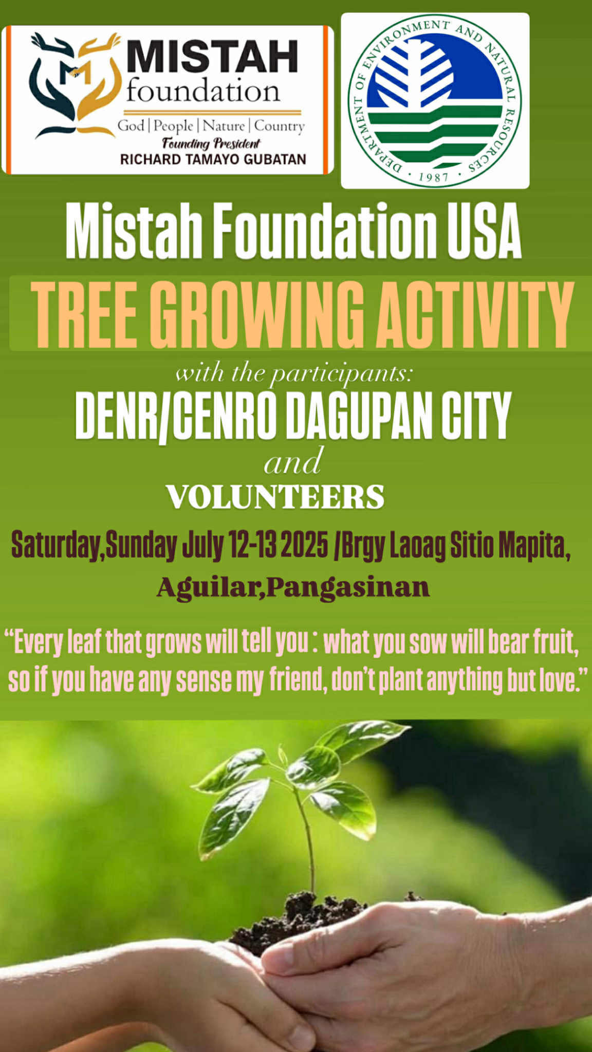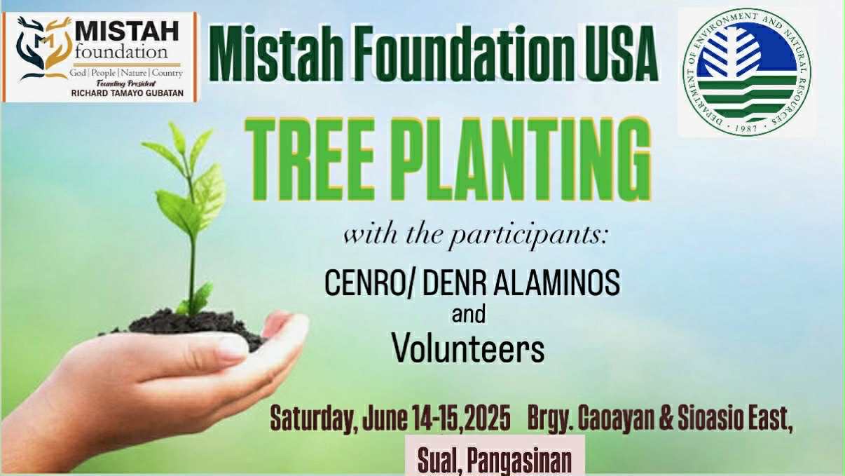 Date: 01 May, 2025 No Comments Mistah Foundation In a united effort to protect and rehabilitate our environment, the Mistah Foundation USA, in partnership with the Department of Environment and Natural Resources (DENR) – Alaminos City and the Municipality of Sual, Pangasinan, conducted a Tree Planting Activity last August 24, 2024. The event was held in the upland areas of Barangays Caoayan and